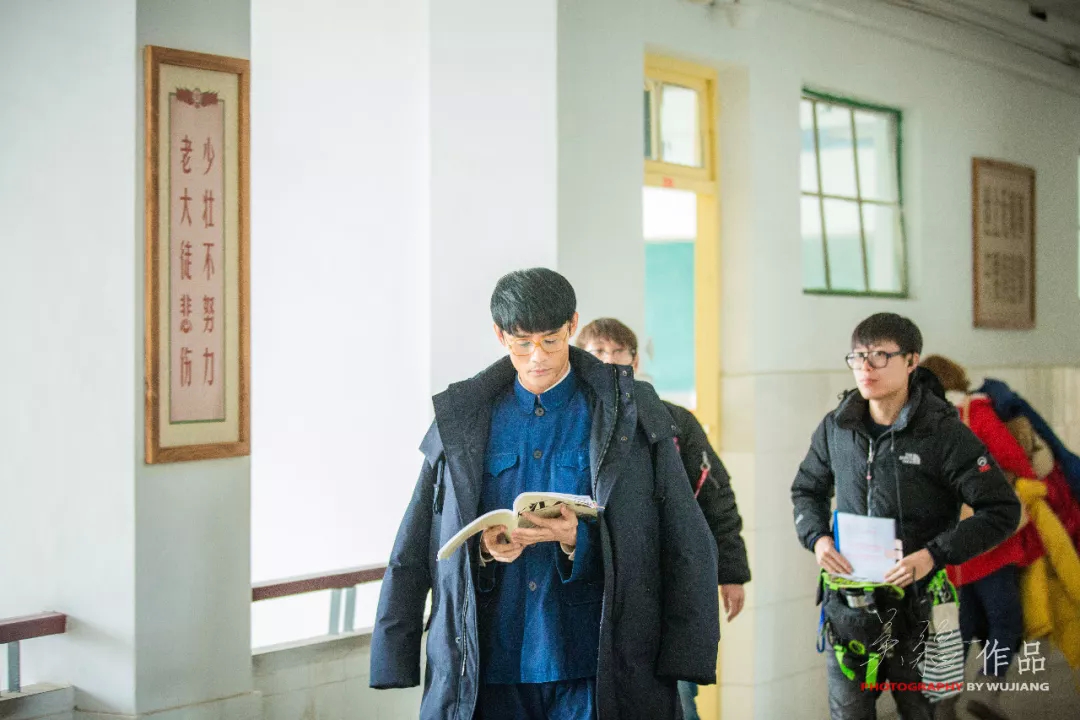除了大环境的布置,连道具作业本、书本、文具盒、走廊上的标语甚至是课桌的摆放布置都透露着工作人员的认真!小编看到王凯老师在休息的时间还不断的熟悉着剧本,尽管环境嘈杂、人声鼎沸,捧起书的他仿佛向四周散发一种安逸森然之气,边走路边眯眼记诵着台词。毕竟好的演员不仅要靠颜值,更是要凭借努力与实力来赢得赞誉。